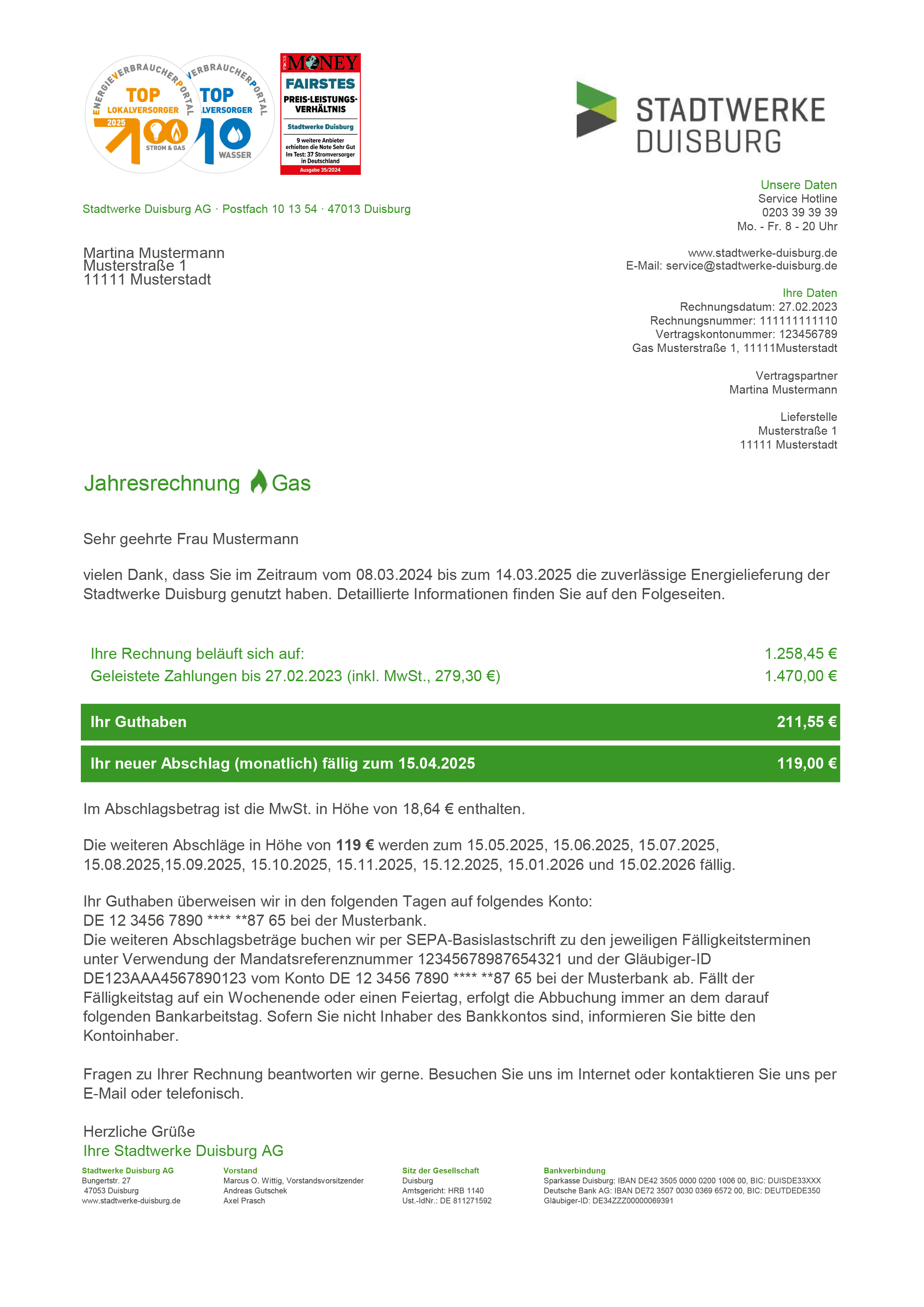 Die Höhe Ihres Guthabens bzw. Ihrer Nachzahlung. Dieser Wert ergibt sich durch Verrechnung, des Rechnungsbetrages und Ihrer geleisteten Zahlungen, beispielsweise den Abschlägen.